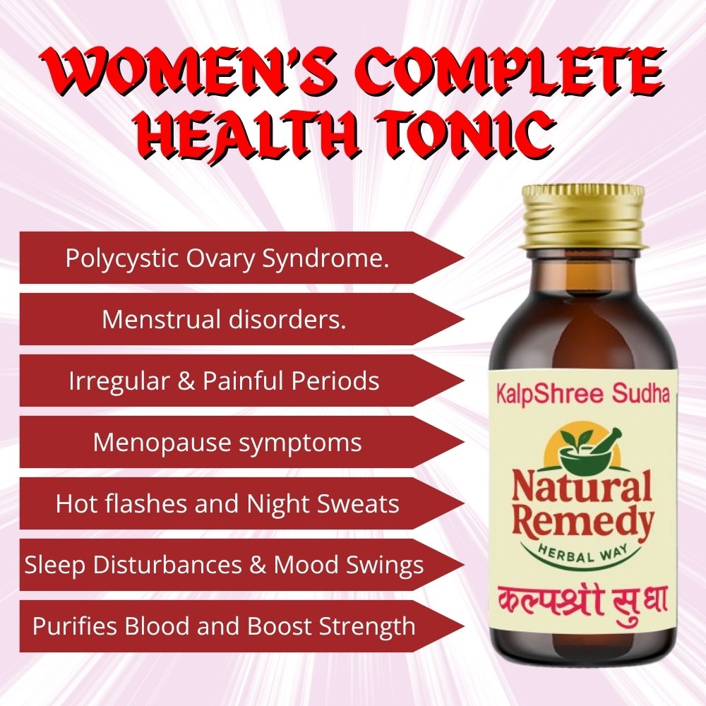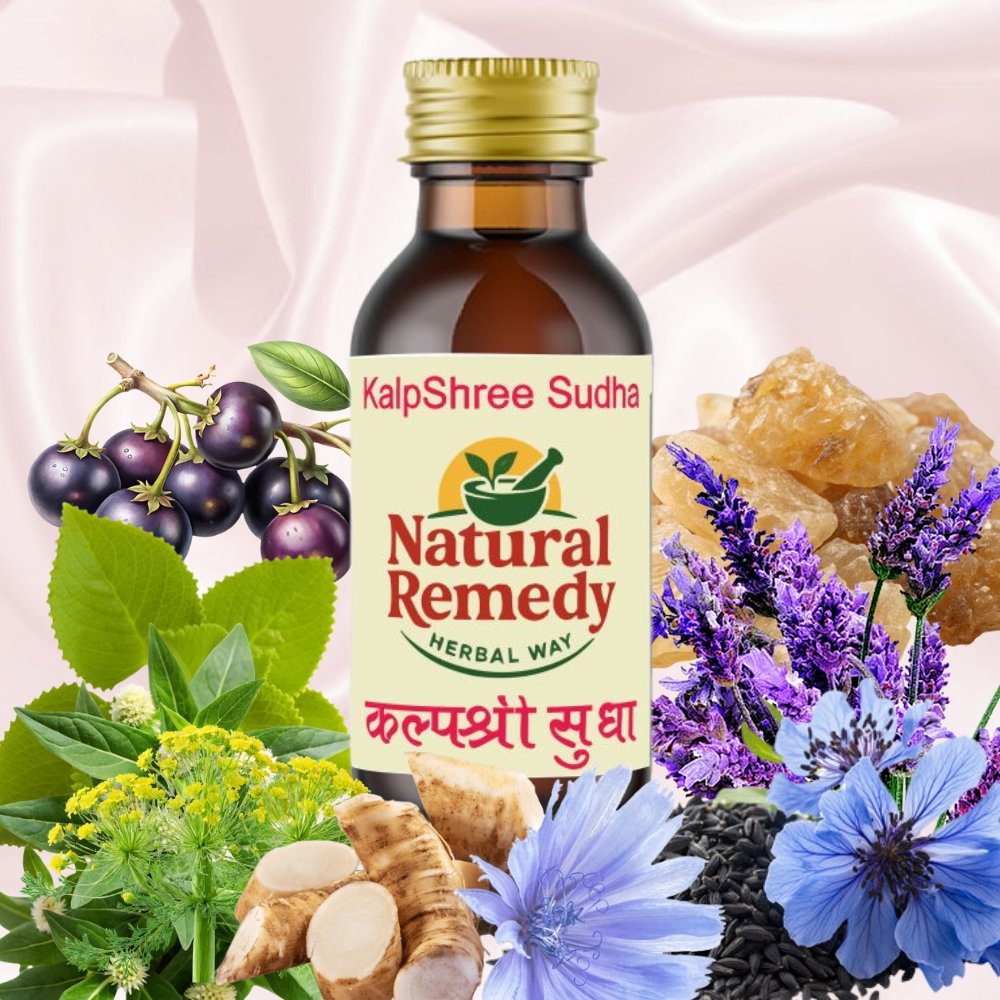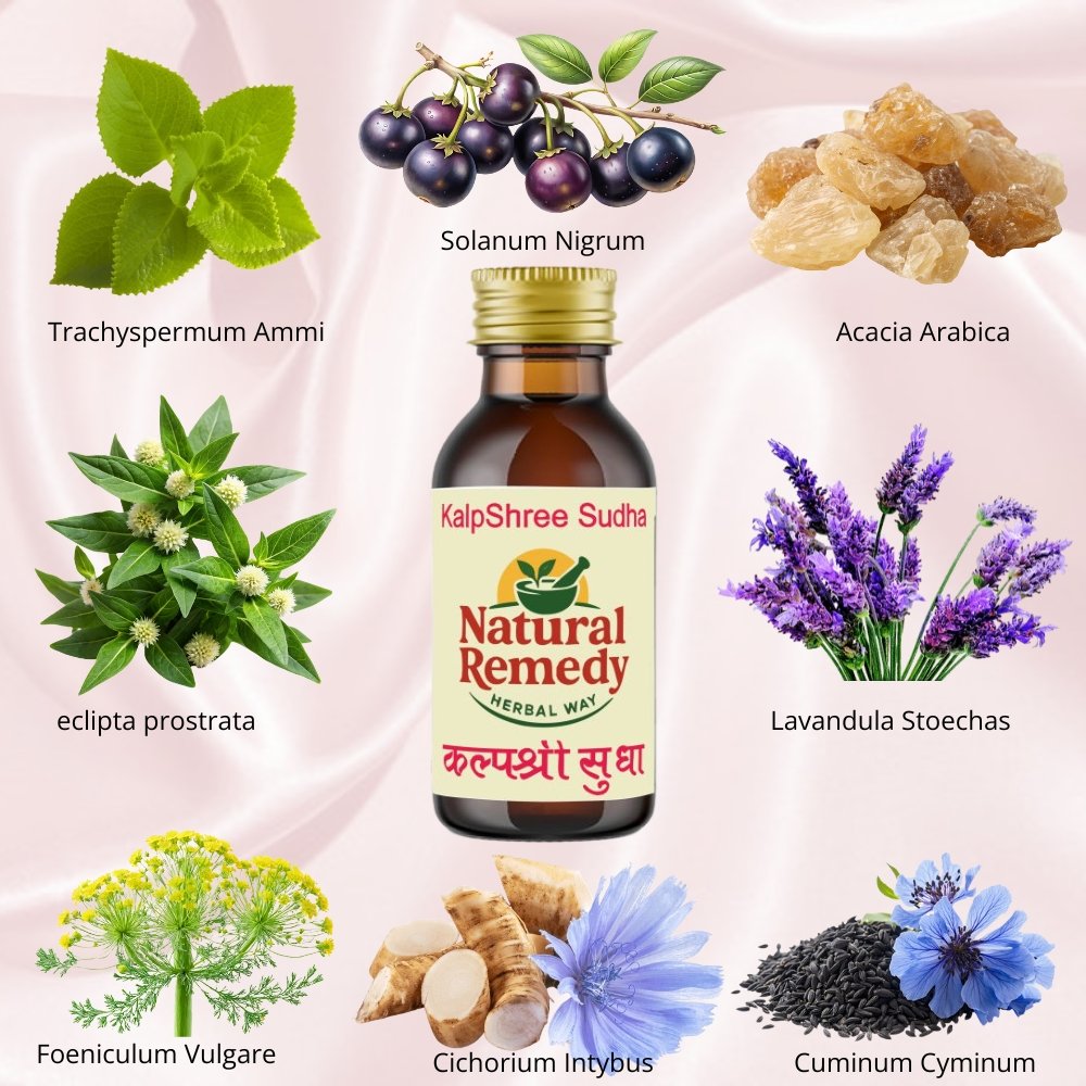 Shree Natural Remedies Kalpshree Sudha-One solution to all women health related problems contains herbs Solanum Nigrum, Cichorium Intybus, Eclipta Prostrata, Foeniculum Vulgare, Trachyspermum Ammi, Lavandula Stoechas, Cuminum Cyminum, Alum and Saccharum officinarum. These herbs are known to balance hormones in women, improve digestion & metabolism, improve hair and skin health and make you to look beautiful and healthy. It helps in following conditions:-