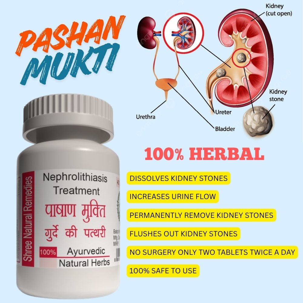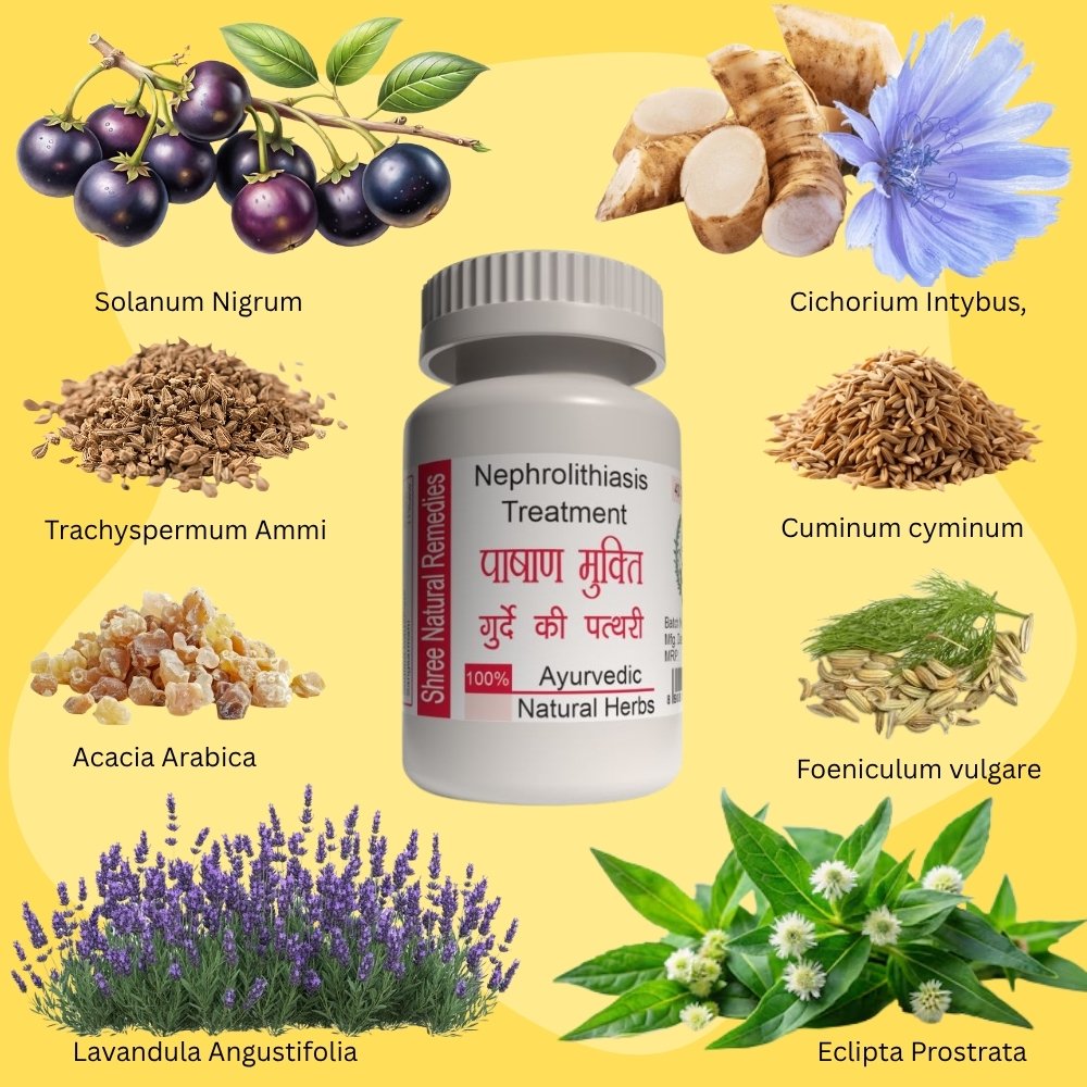 Shree Natural Remedies Pashan Mukti is a specialized Ayurvedic formulation designed to promote kidney health and effectively address kidney stones. This potent blend harnesses the power of natural herbs Solanum Nigrum, Cichorium Intybus, Eclipta Prostrata, Foeniculum vulgare, Trachyspermum Ammi, Lavandula Angustifolia, Cuminum cyminum, Alum and Acacia Arabica, these herbs are known for their diuretic and anti-inflammatory properties. By enhancing kidney function and flushing out toxins, Pashan Mukti not only aids in the dissolution and expulsion of kidney stones but also supports overall renal wellness. Its holistic approach ensures that you can maintain a healthy urinary tract while minimizing discomfort and preventing recurrence.