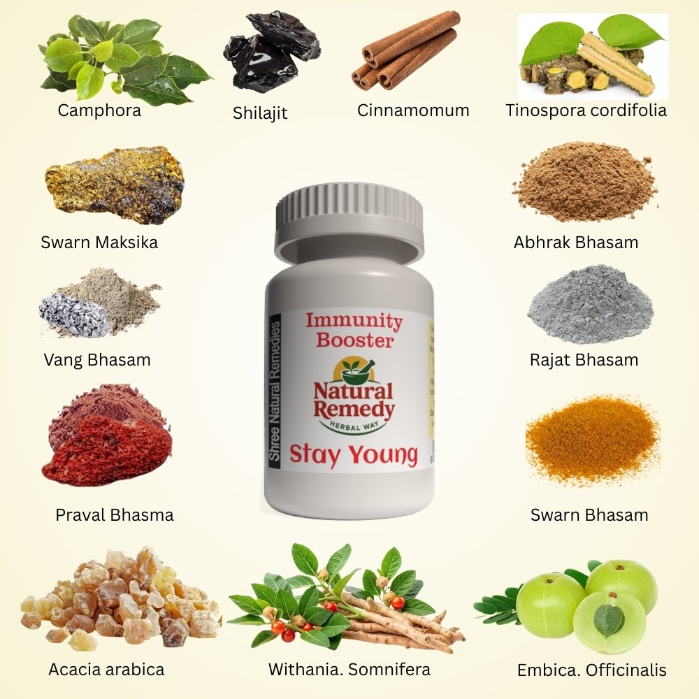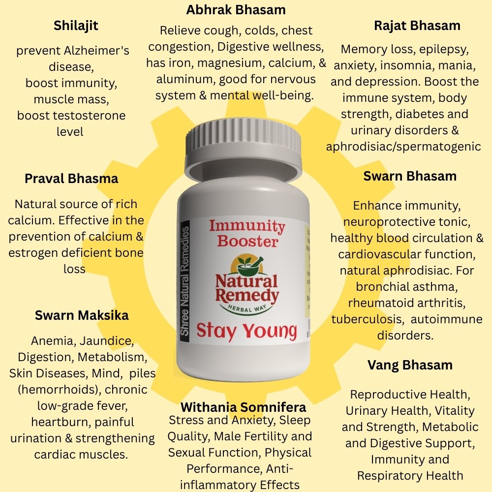 Shree Natural Remedies Stay Young 100% Ayruvedic formulation with Shilajit, Praval Bhasma, Vang Bhasam, Swarn Maksika, Swarn Bhasam, Rajat Bhasam, Abhrak Bhasam, Tinospora cordifolia, Withania. Somnifera, Cinnamomum, Camphora, Embica. Officinalis and Acacia arabica active herbs. Stay Young herbal formulation aims to promote an individual's mental and physical health. Encapsulating the natural ingredients, our product also supports the health of musculoskeletal and nervous systems and healthy, strong bones. Contains the power of Shilajit, known to benefit men seeking to improve testosterone levels, overcome weakness, and improve sexual wellness. Contains Ashwagandha which helps reduce anxiety and stress while boosting stamina and energy. Regular use may alleviate symptoms of stress, depression, chronic fatigue, insomnia, weakened immunity and lack of vitality.
