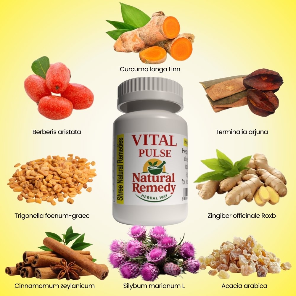 Shree Natural Remedies Vital Pulse is 100% herbal formulation consist of Curcuma longa Linn., Trigonella foenum-graec., Terminalia arjuna, Silybum marianum, Zingiber officinale Roxb, Cinnamomum zeylanicum, Berberis aristata, Acacia arabica which are proven scientifically and have literary references of Ayurveda Books to be effective in following conditions:-
